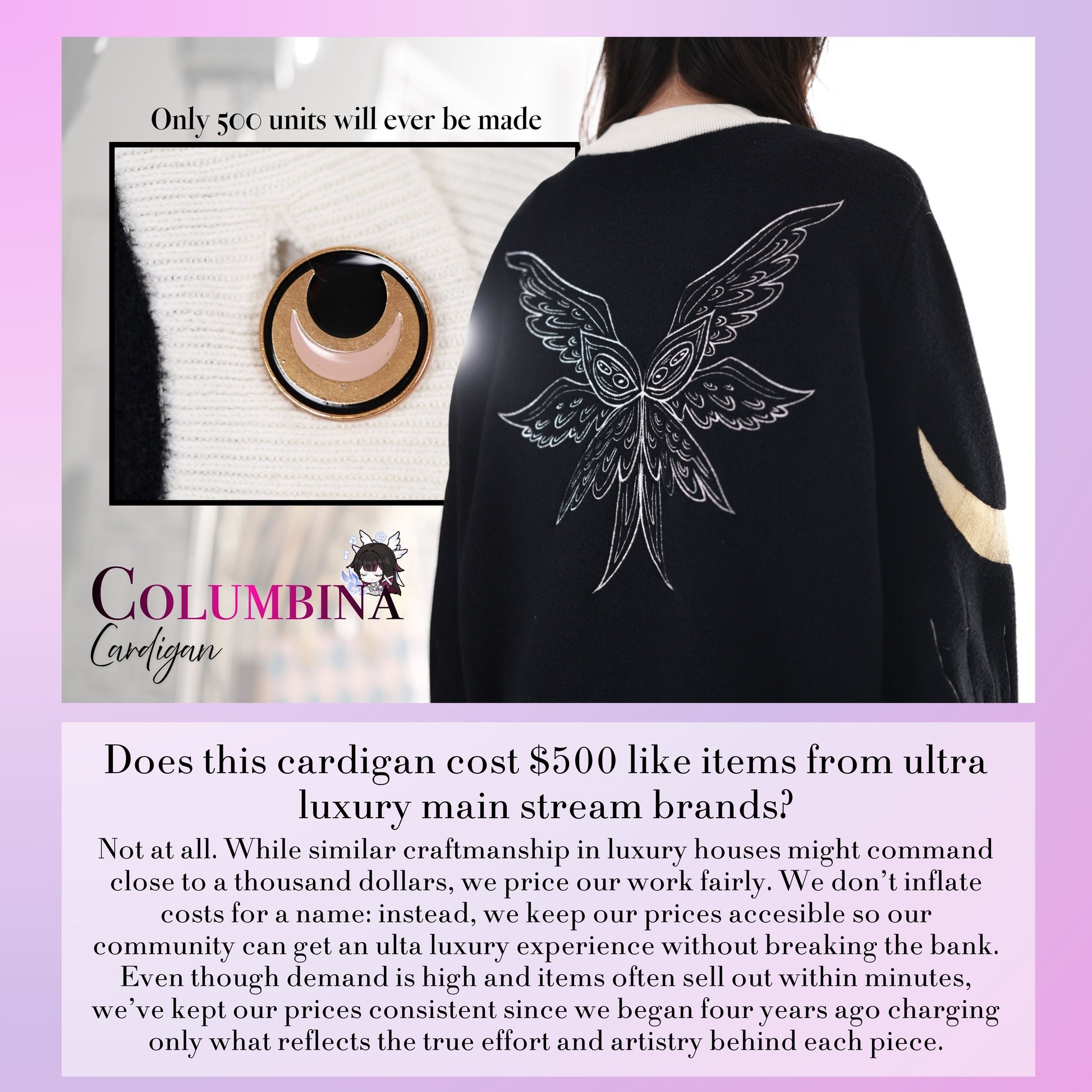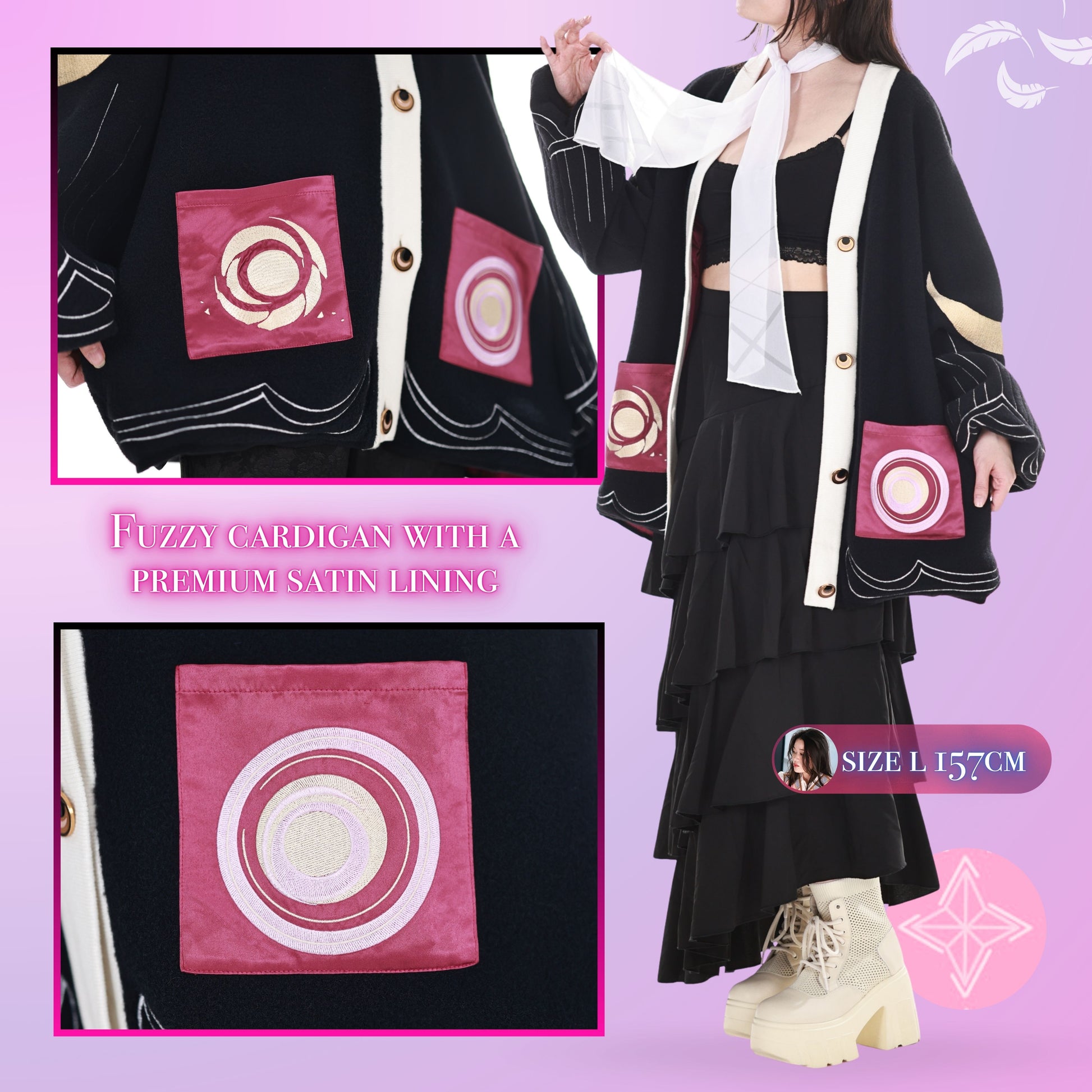 The inside of this cloak is made from one of the softest satin fabrics you will ever touch. It feels like you are hugged by cloud. The whole cardigan is designed to have a warm and comforting weighted blanket type of feel to help relief anxiety and keep you comfortable all day. The design actually looks similar to cloaks from luxury designer brands. So even though it has the comforting feel of a weighted blanket, you can wear it to any occasion in public. Our models got countless compliments when filming outdoors. So, we were happy to see the design plans worked out and people where not just not noticing this item as fan merch, but it also got complimented. An additional point that makes this cloak very special and useful in your daily life is that the outside is made from actual high-end mohair blend fabric like commonly used by luxury brands for their cardigans. This means even if it is a windy day, this cloak will keep you warm when you wear it outside. All items also have special embroidered designs crafted by a team of artists who came up with the drawings to subtly represent your favorite characters and a team of artists who turned them into the beautiful embroidery patterns you can see on each item.